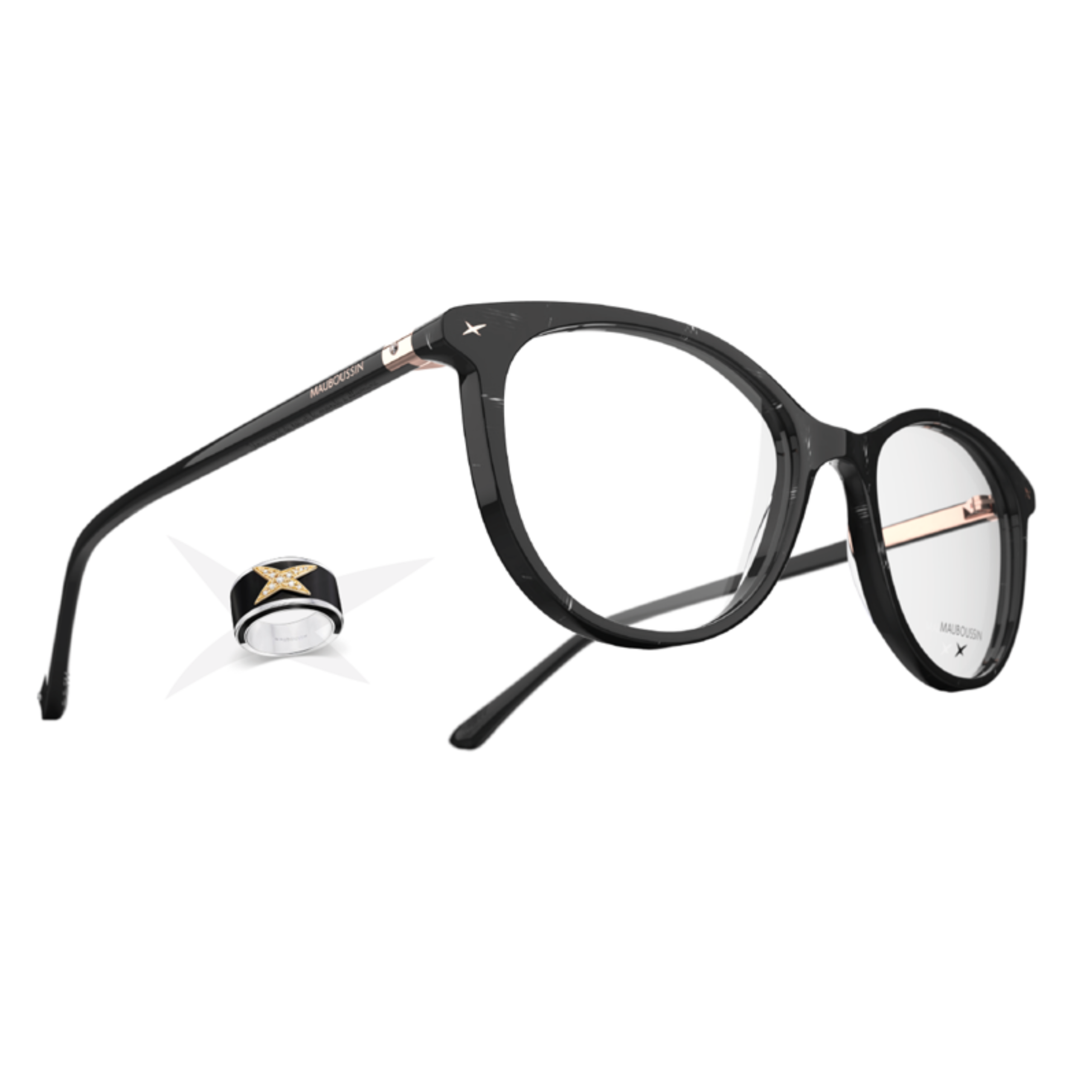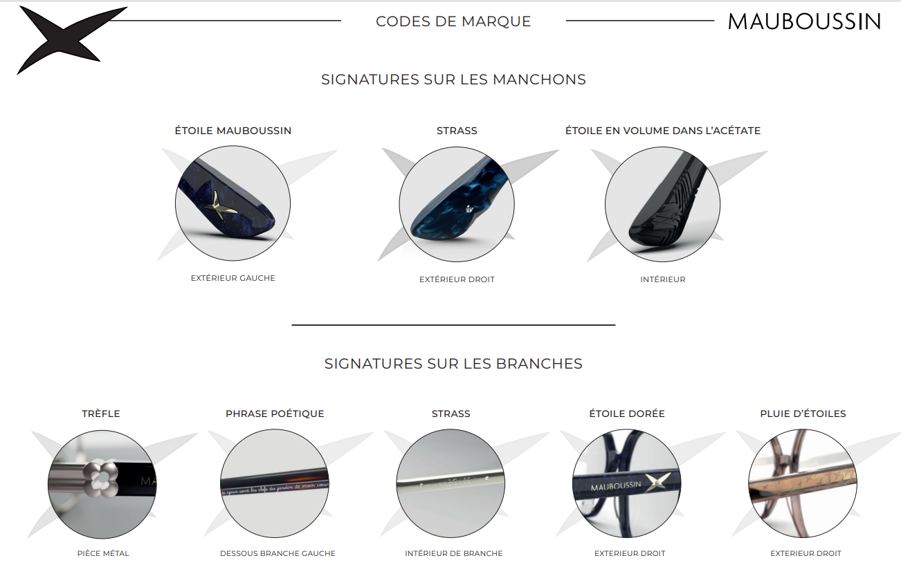 Chaque modèle Mauboussin, qu’il s’agisse de montures optiques ou solaires pour homme comme pour femme, se veut une véritable création. La collection femme est directement influencée par l’univers prestigieux de la maison. Les montures reprennent les codes traditionnels du bijou : strass, étoiles, perles, etc. Chaque détail est à l’image de la marque, jusqu’à l’étui qui est inspiré du sac signature Mauboussin. La marque est par ailleurs associée à l’élection de miss France.